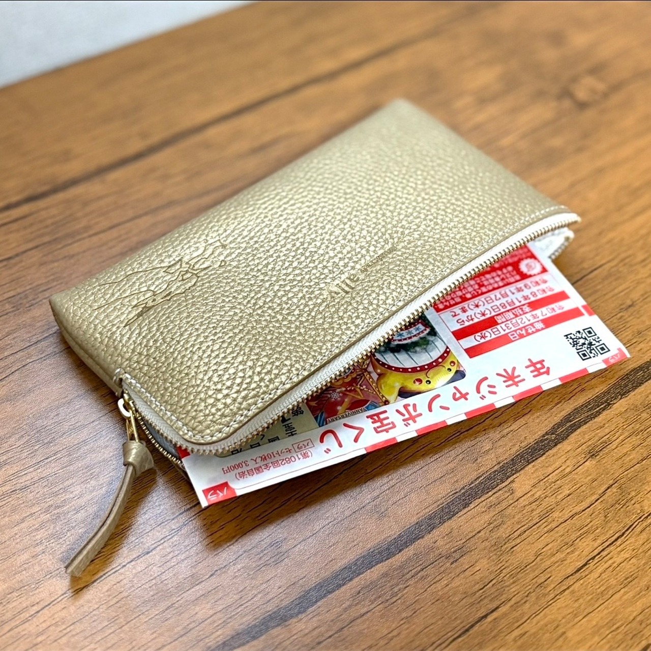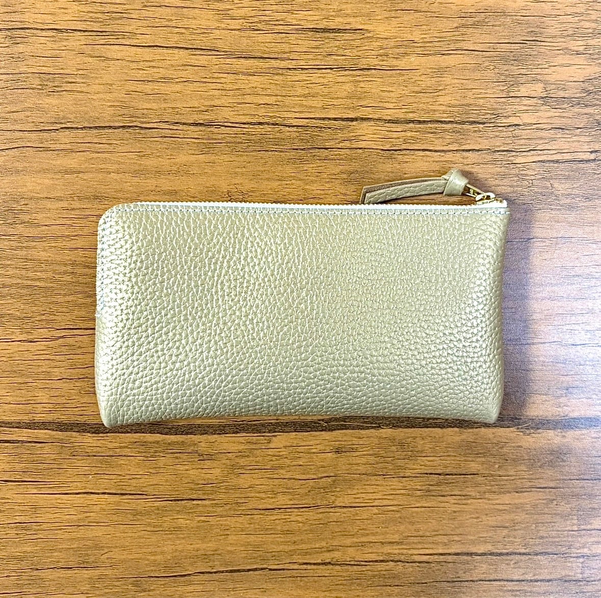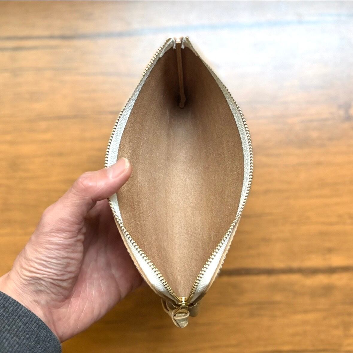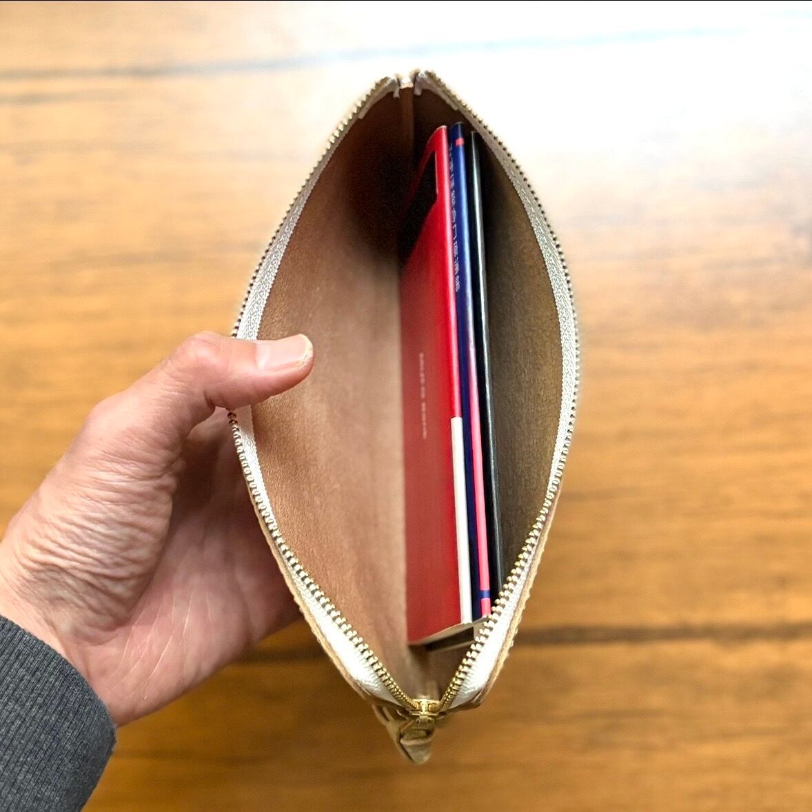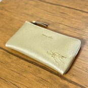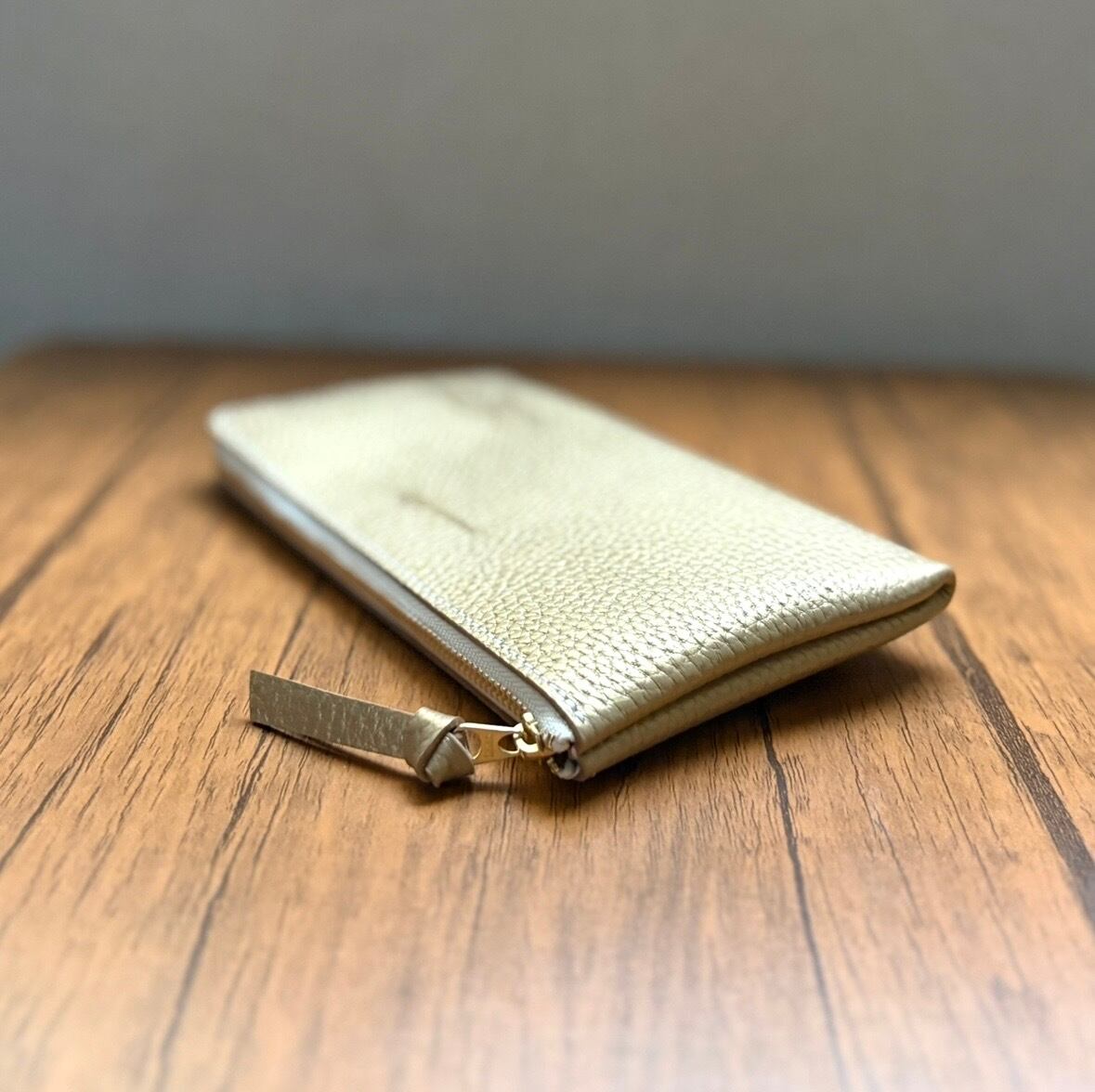 素材は国産のエンボスレザーで、柔らかくふっくらした手触りで、とても品のあるシャンパン・ゴールドの革です。