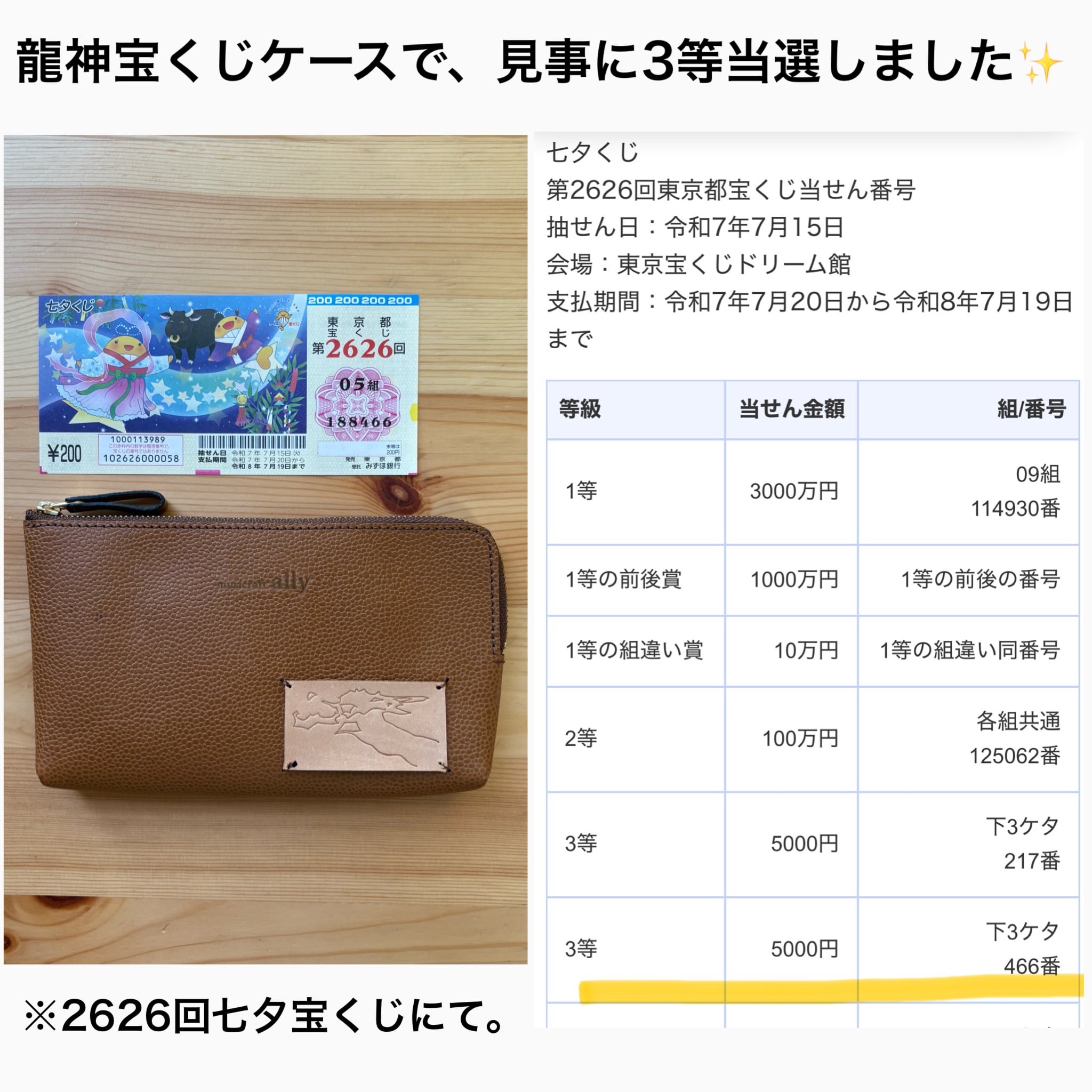◎このたび2025年の七夕宝くじにおきまして、龍神宝くじケースに保管しておいた宝くじが3等に当選いたしました!