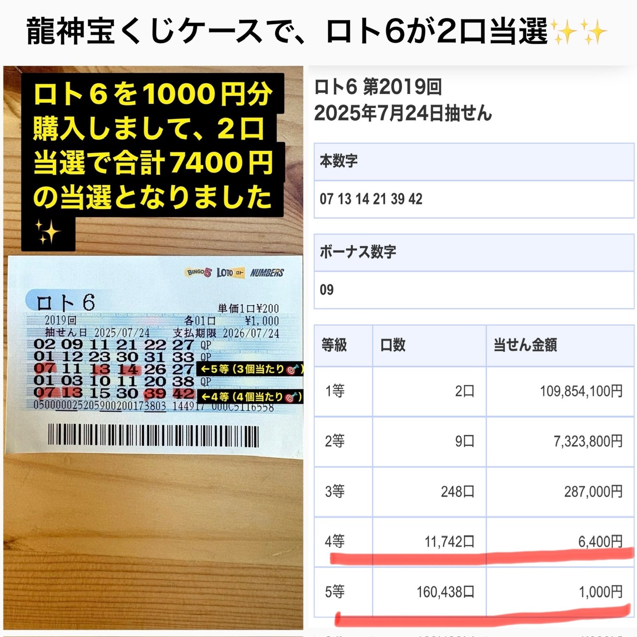 ◎2025年7/24のロト6にて、龍神宝くじケースに保管しておいた券が4等と5等にダブル当選いたしました!
