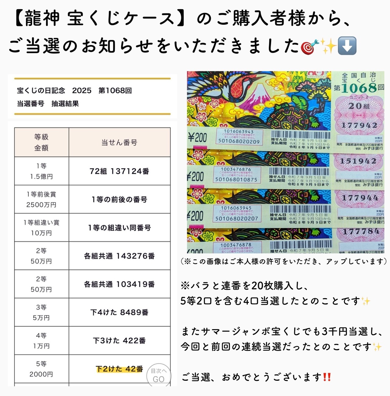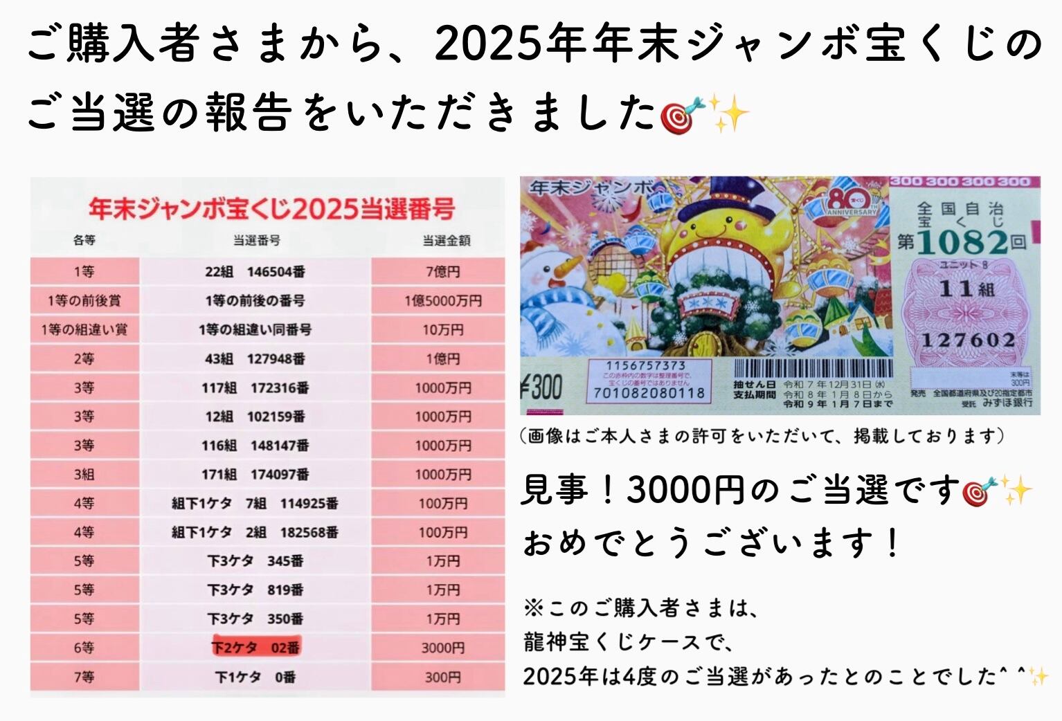 ◎2025年の年末ジャンボ宝くじのご当選報告をいただきました!おめでとうございます✨